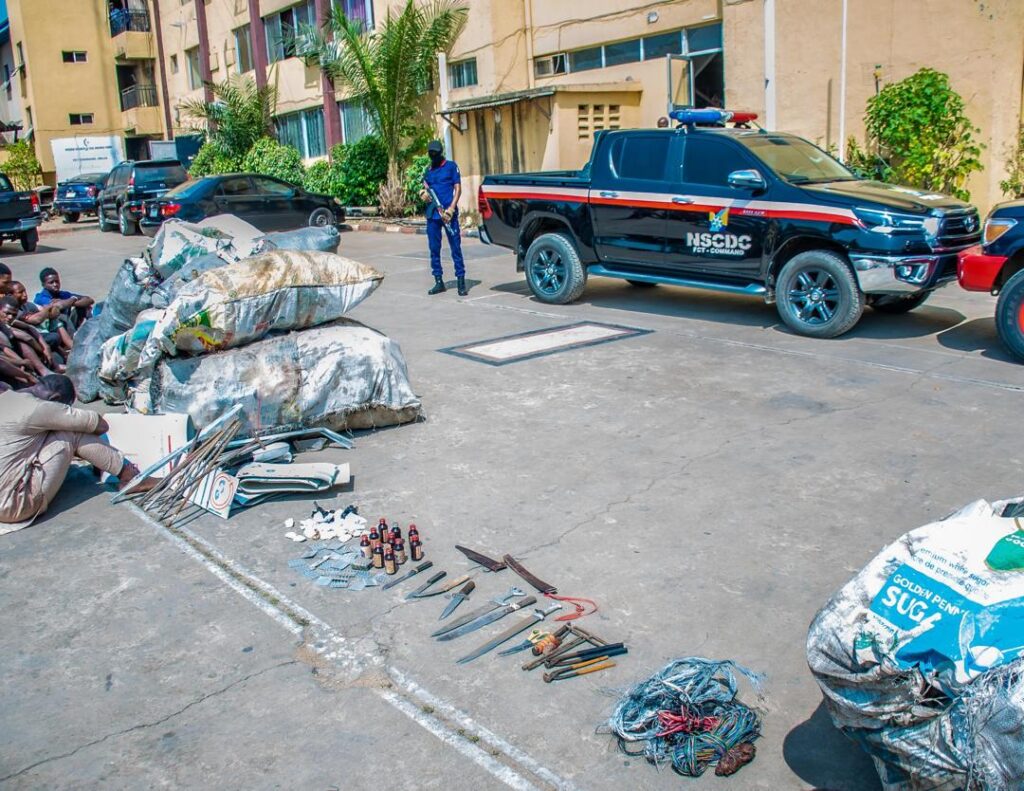 Parading 36 scavengers who were arrested with dangerous weapons and vandalized items, the Commandant, Nigeria Security and Civil Defence Corps (NSCDC), Federal Capital Territory (FCT) Command, Dr. Olusola Odumosu, said scavengers who roam the streets of FCT, indiscriminately, perpetrate all forms of criminal activities under the guise of scavenging.