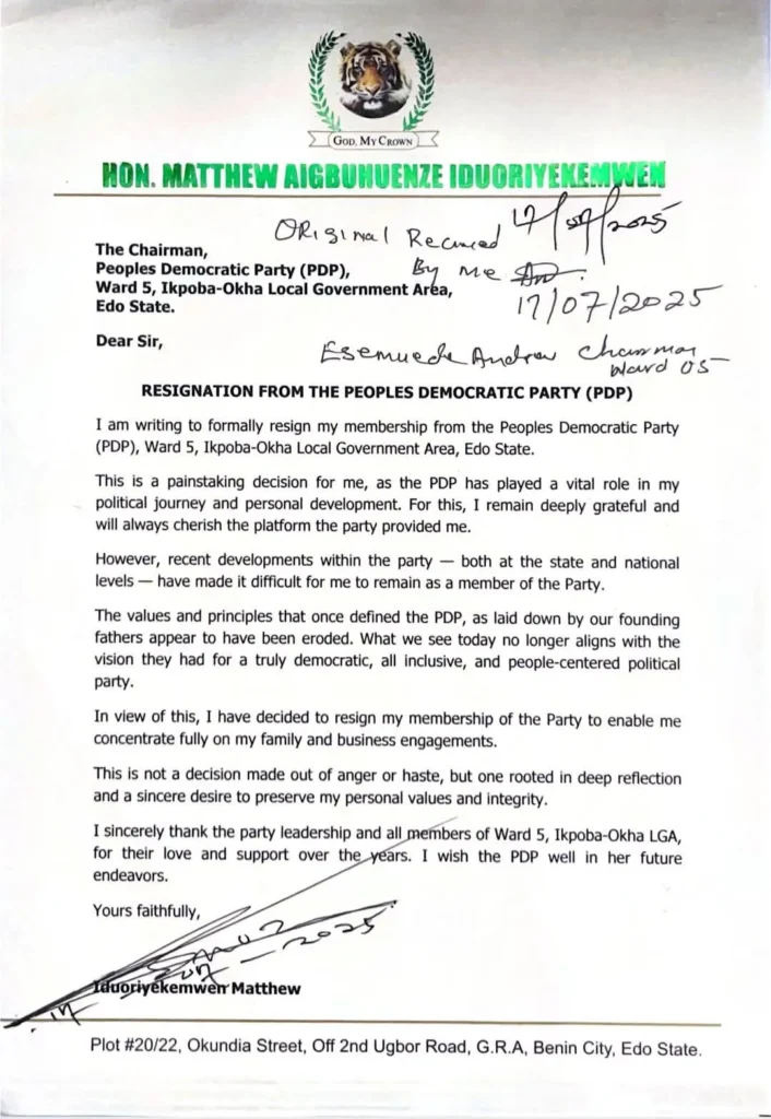 The letter which was addressed to PDP Ward 5 chairman, Ikpoba-Okha Local Government Area, reads partly: “I am writing to formally resign my membership from the Peoples Democratic Party (PDP), Ward 5, Ikpoba-Okha Local Government Area, Edo State.