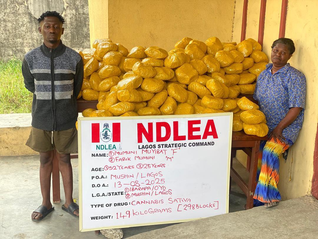 In Lagos state, a 52-year-old woman Muyibat Mumuni was arrested with her son Faruk Mumuni, 25, by NDLEA operatives at Ladega street, Mushin last Wednesday for storing and distributing 298 blocks of Ghana Loud weighing 149 kilogrammes while another suspect Emmanuel Samuel was nabbed last Friday in Ajah area of Lekki where 8.5 kilogrammes Canadian Loud, a strain of cannabis was recovered from their apartment