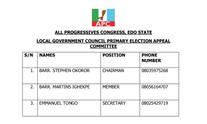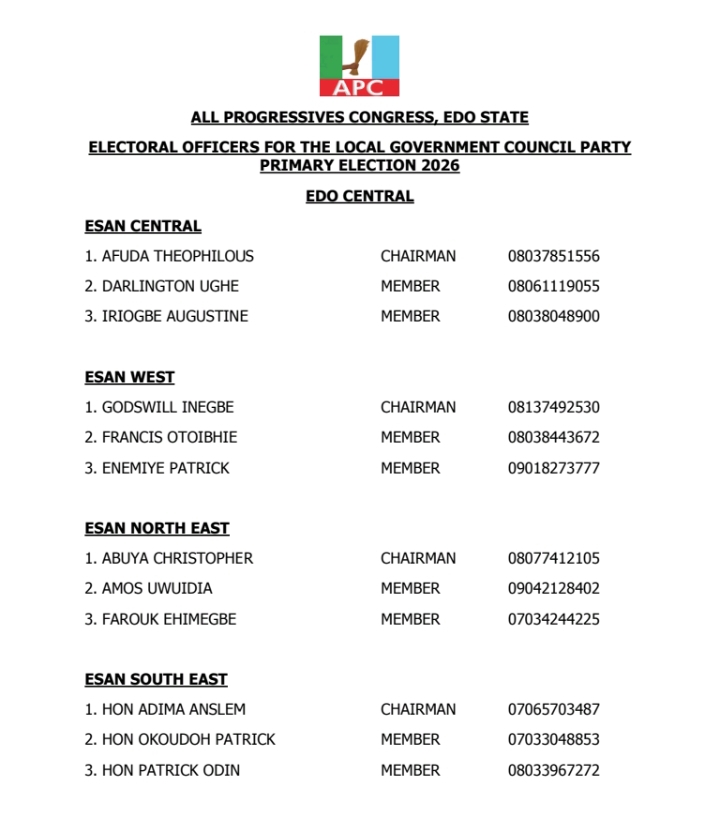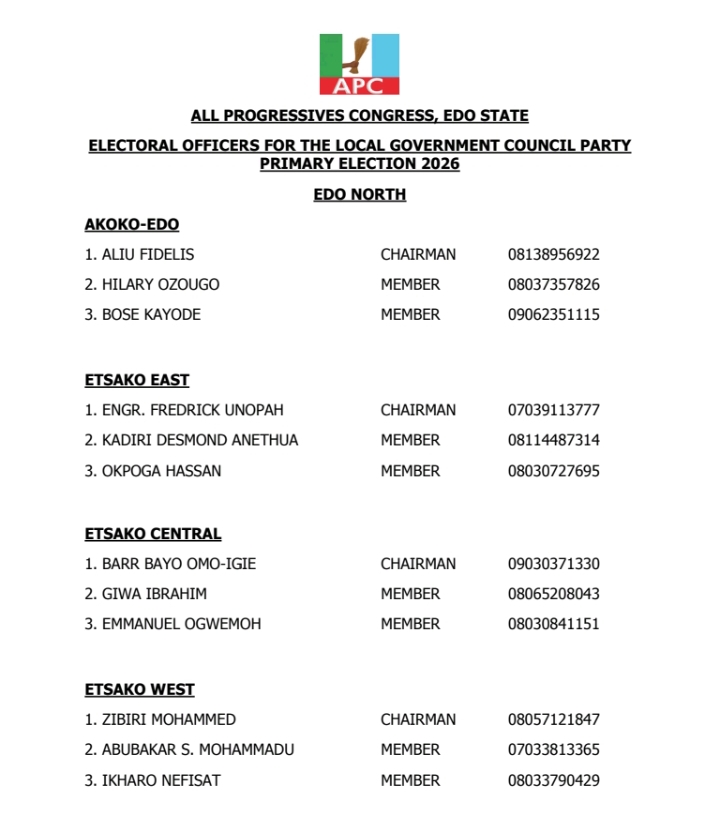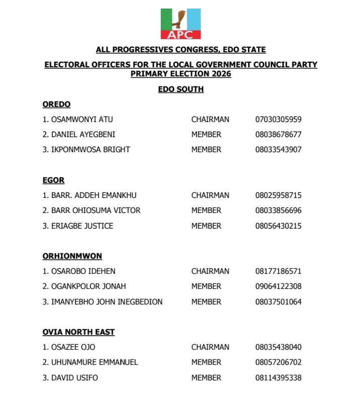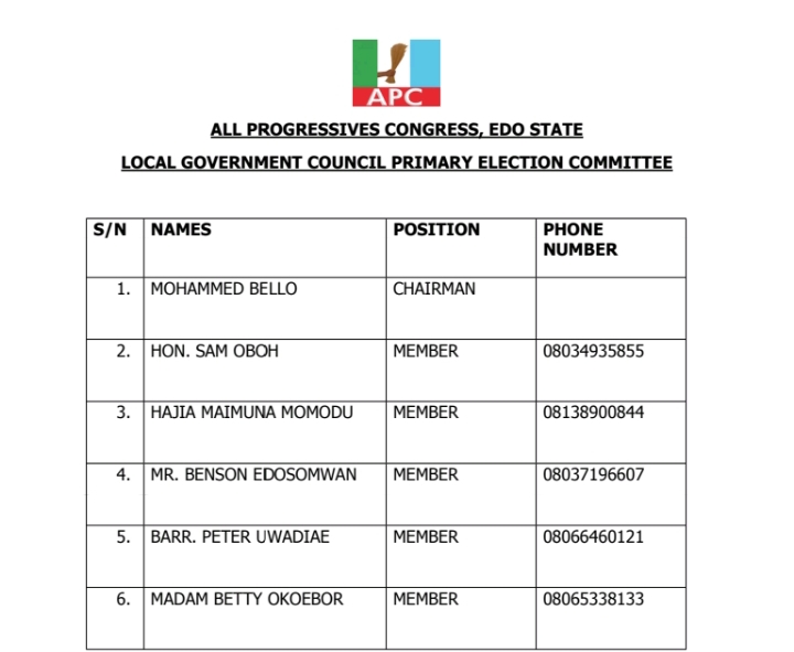 The All Progressives Congress (APC), Edo State chapter has inaugurated a 3-Man Committee to superintend its council election primary scheduled to hold Friday, 3 March, 2026.