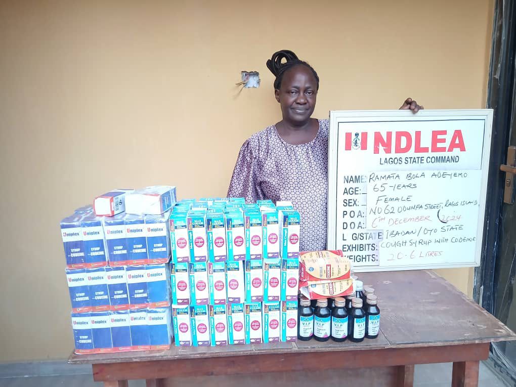 In Lagos, a grandmother, 65-year-old Ramata Adeyemo, was on Friday arrested by NDLEA operatives at 62 Odunfa Street, Lagos Island, where 20.6 liters of codeine-based syrup were recovered from her. Also arrested in Lagos was Alhaji Lawan Manga, who was picked up at Ogundana Street, Ikeja, last Thursday, while 4.7 kilograms of cannabis and 1.3 kilograms of tramadol were recovered from him.