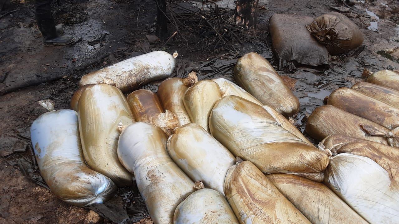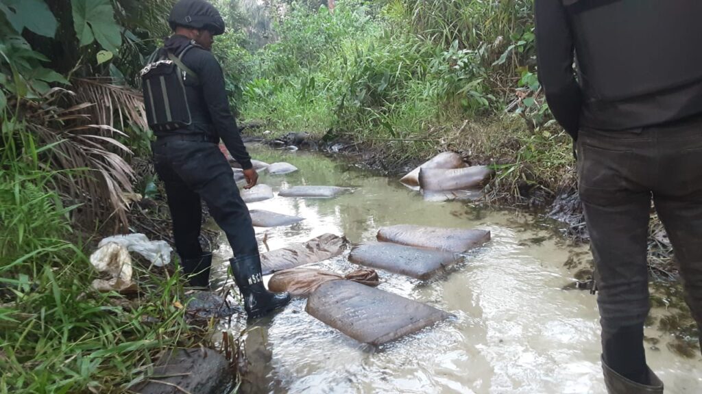 The following exhibits were recovered at the crime scene: Large quantities of already syphoned stolen crude oil packaged in Cellophane Bags and Kegs, Materials used for refining crude oil illegally, Galvanised metal pipes in numbers, abandoned clothing and other personal effects, and metal buckets, amongst others, were all uncovered and dismantled.