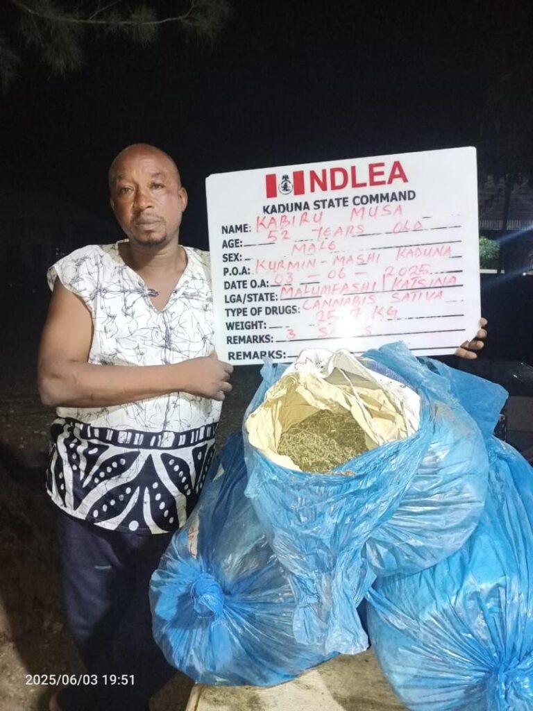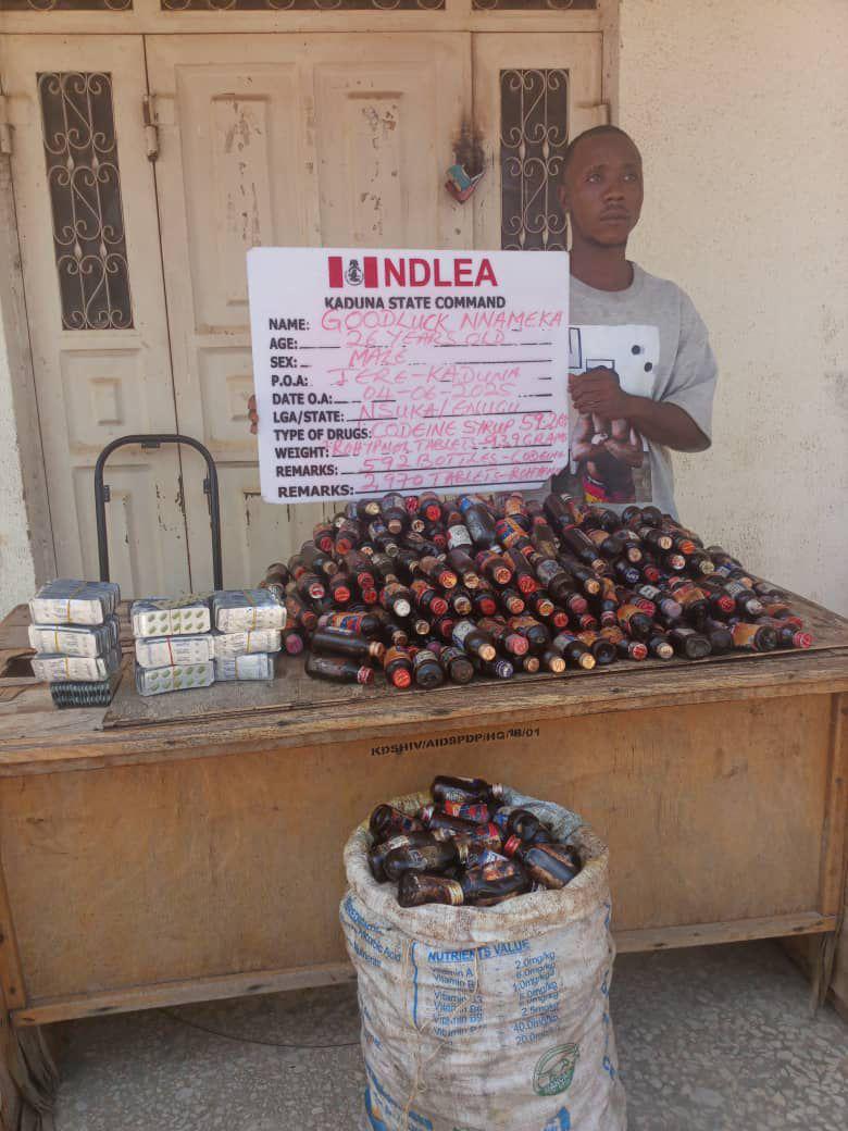 In Kaduna, operatives of the state command of NDLEA on patrol along Abuja – Kaduna expressway last Tuesday arrested 29-year-old Goodluck Nnaemeka with 612 bottles of codeine-based syrup and 2,970 pills of flunitrazepam. In another operation on the same day, a 52-year-old wanted drug dealer, Kabiru Musa (a.k.a KB), was arrested at Kurmin Mashi. A total of 25.7 kilogrammes skunk was earlier recovered from his base.