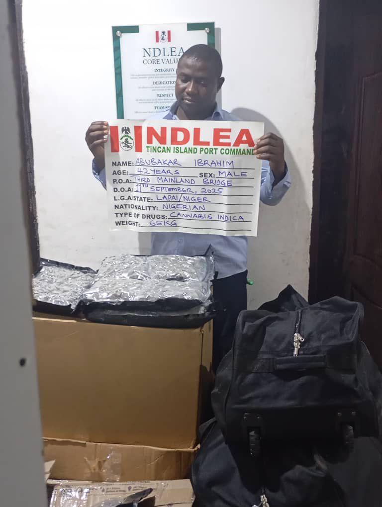 Another shipment of Canadian Loud with a total weight of 65 kilogrammes was tracked from the port to Third Mainland bridge where NDLEA operatives intercepted a Toyota Sienna vehicle conveying the consignment, recovered it and arrested the driver Abubakar Ibrahim, 42 on Thursday 11th September.