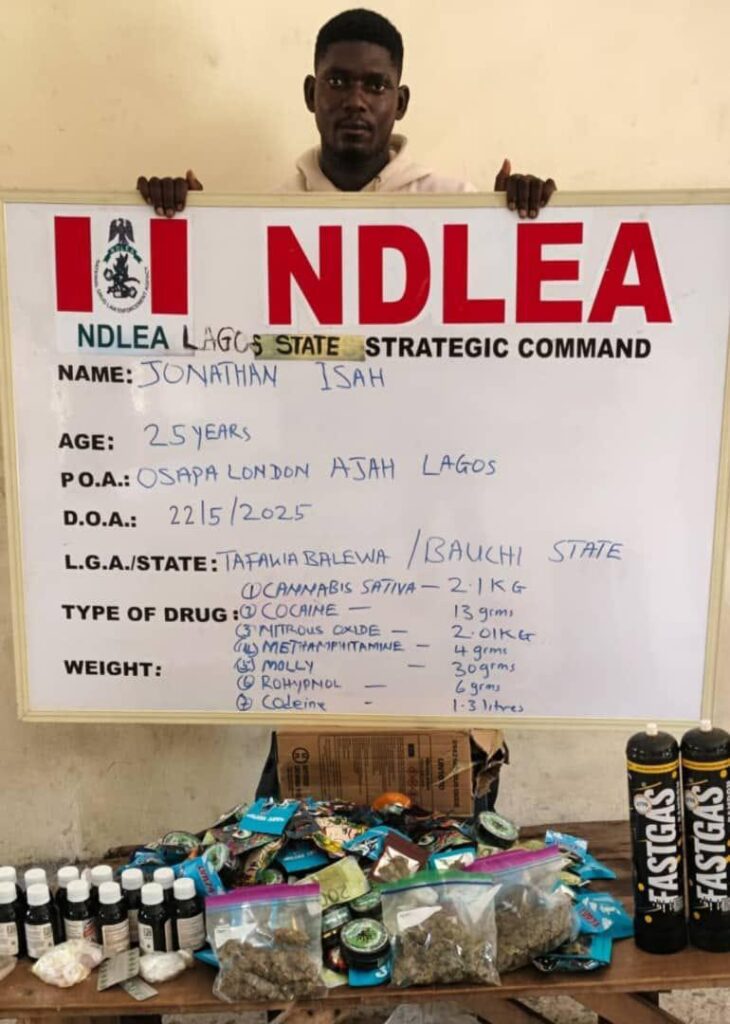 Operatives in Lagos raided the Osapa London area of Lekki where they arrested a suspect Jonathan Isa with different quantities of Cocaine, Methamphetamine, Molly, Rohypnol, Codeine, Cannabis and Nitrous Oxide while another raid at Idasun, Eleko, Ibeju Lekki last Saturday led to the arrest of Olamilekan Idowu and seizure of 48kg skunk.