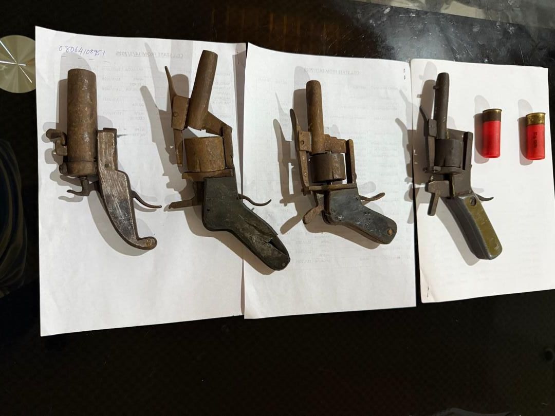 Exhibits recovered from the suspects include one MTN SIM card, four locally made pistols, seven rounds of 9mm ammunition, two live cartridges, a mini bus, and a Toyota Camry.