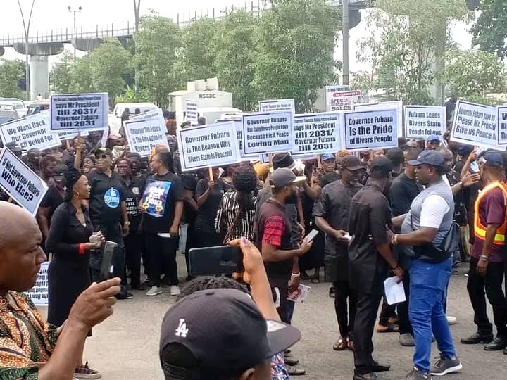 The residents of Rivers State’s Old Port-Harcourt Township in the Port-Harcourt city Local Government Area have peacefully protested and demanded that Siminialaye Fubara, the suspended governor, be reinstated so he can continue to lead the state effectively.