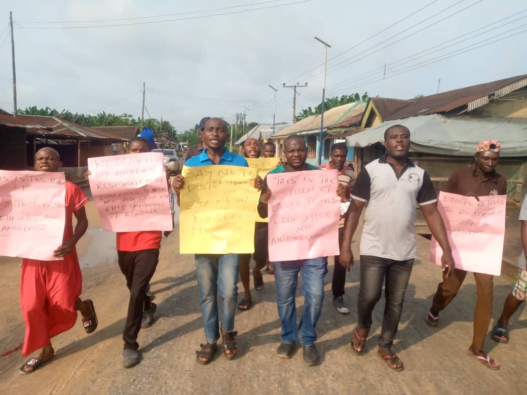 Addressing newsmen, leader of the protesters and Chairman, Omofo Youth Federation (OYF) Community, Comrade Kpomasuruchi Dimkpa said the youths and Omofo community will resist every attempt to steal the mandate of their people by all means.