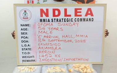 …Businesswoman conceals 1.4 kg meth in butt pad underwear Two Brazil returnees: Ofoma Sunday and Ukachukwu Ikechukwu have excreted a total of 116 wraps of heroin and cocaine they ingested after days in observatory custody following their arrest by operatives of the National Drug Law Enforcement Agency (NDLEA) at the Murtala Muhammed International Airport, Lagos….